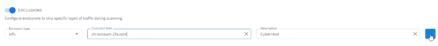Select Exclusion Type as “URL”, enter the domain name under Excluded Item, and optionally add a Description (for example, “CyberHoot”) to help you quickly identify the purpose of that domain.