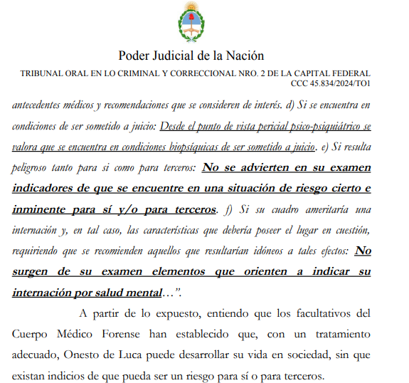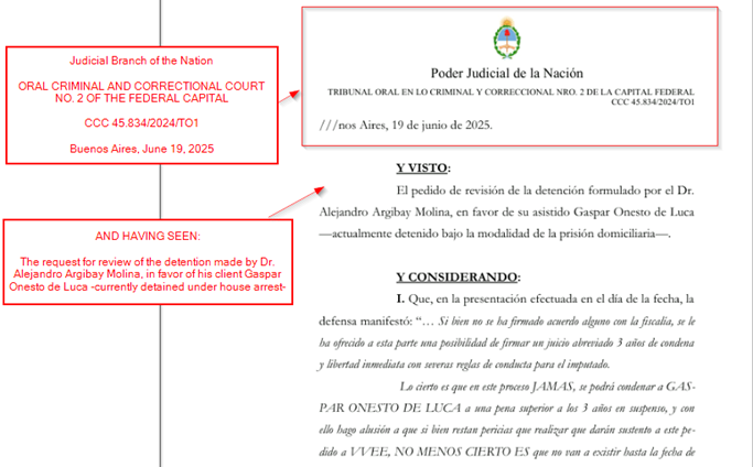 The decoy document used in this campaign is a legitimate-looking Argentine federal court resolution written in formal legal Spanish. It purports to originate from the Poder Judicial de la Nación and references a real judicial body (Tribunal Oral en lo Criminal y Correccional N° 2 de la Capital Federal), complete with case numbering, judicial signatures, and procedural language. The document discusses a judicial review of preventive detention and grants conditional release (excarcelación) to the accused, citing medical evaluations, legal justifications, and specific articles of the Argentine Criminal Procedure Code. Its structure, terminology, and formatting closely mirror authentic court rulings, significantly increasing its credibility among legal and judicial professionals.