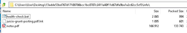 We analyzed a downloaded ZIP (D:auto_black_abuseresourcesunzipped20251215_141941_2025-11-2813adde53bd767d17108786bcc1bc0707c2411a40f11d67dfa9ba1a2c62cc5cf3.zip) Archive that contained a malicious LNK (info/juicio-grunt-posting.pdf.lnk) file, a BAT-based loader script (info/health-check.bat), and a judicial-themed PDF decoy document. The archive served as the initial delivery package for the campaign’s multi-stage execution chain.