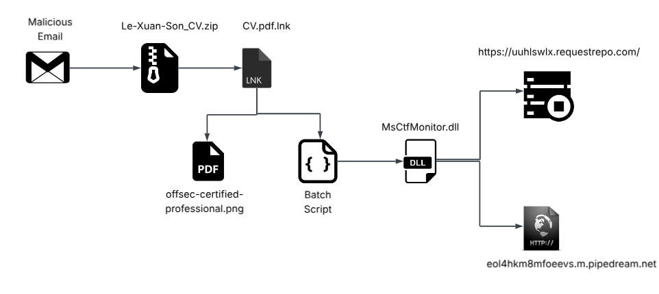 Well, focusing on the attribution-oriented details, requires concrete evidence on multiple parameters such as re-use of Tactics, Techniques & Procedures), infrastructural re-use and victimology. As, previously, we have seen around the month of March, 2025, that likely Chinese-state sponsored threat group targeted Vietnam with fake CV-based lure, where the name of the lure stands out to be CV-Nguyen-Lam-San-Xuat-Noi-Dung-Compress.pdf , also in this same campaign, we have seen the name of the lure to be `CV-Nguyen-Van-A, a similar nomenclature had been used, which adds a very little confidence to attribute both the campaigns under similar cluster of same threat entity.