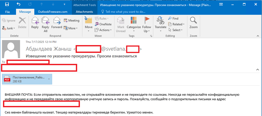 The attachment was a malicious PDF file titled “Постановление_Районный_суд_Кчрм_3566_28-01-25_OL4_scan.pdf” (the title, written in Russian, posed it as an order of district court).