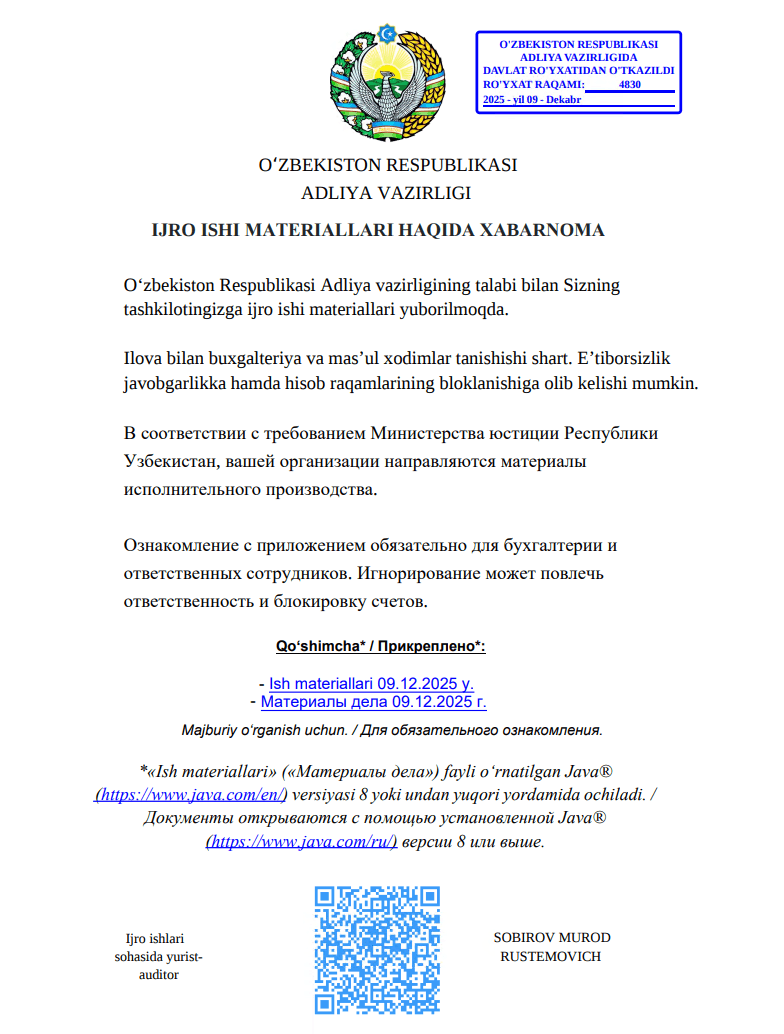 [redacted] AKMALZHON IBROHIMOVICH You will receive a court notice. Application for retrial. The case is under review by the district court. Judicial Service. Mustaqillik Street, 147 Uraboshi Village, Quva District.