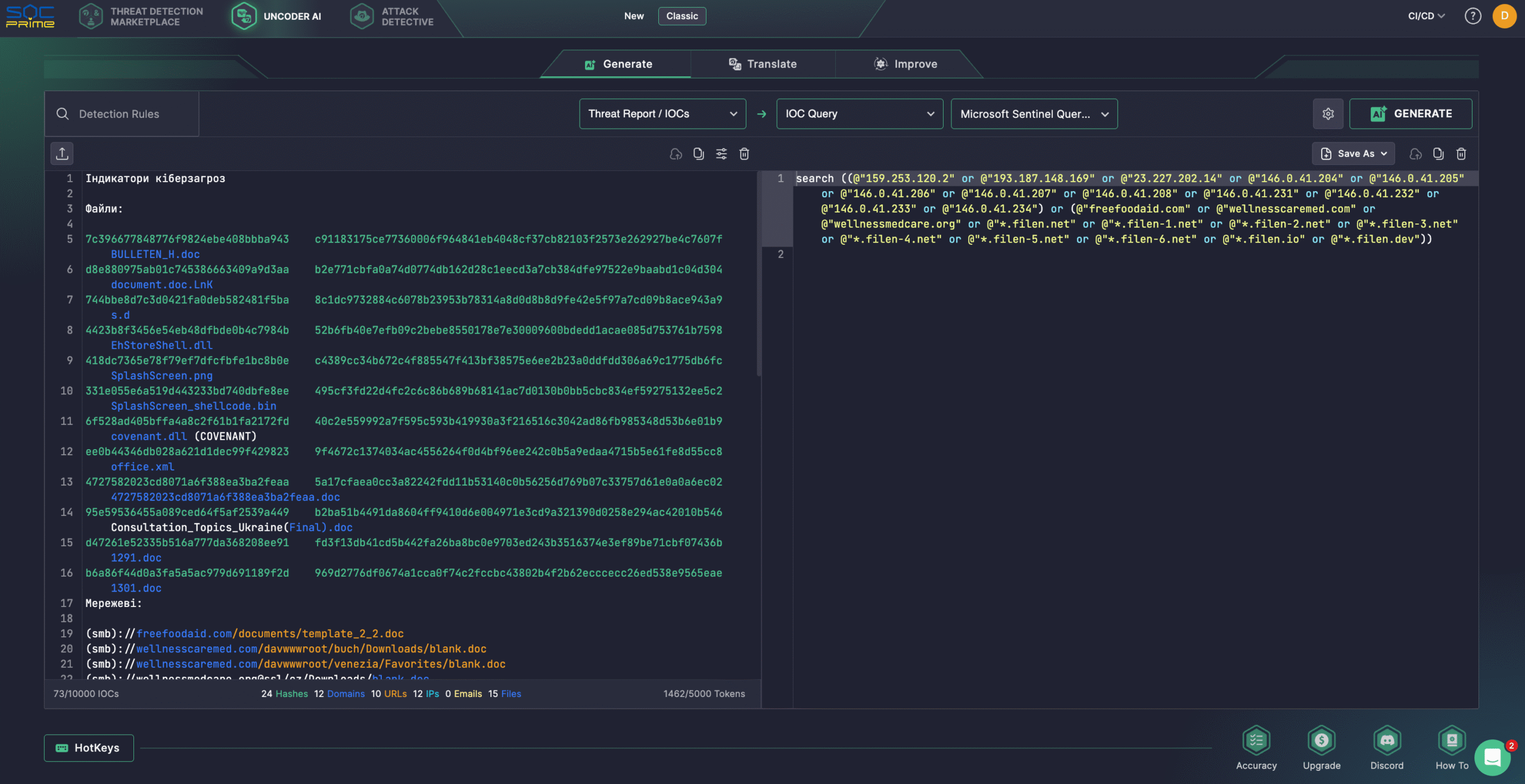 Security teams can also rely on Uncoder AI to create detections from raw threat reports, document and optimize code, and generate Attack Flows. Additionally, cyber defenders can easily convert IOCs from the latest CERT-UA#19542 alert into performance-optimized queries compatible with your security stack.