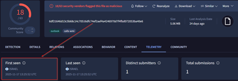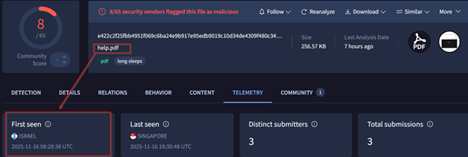 This sample had been uploaded on the public sandbox corpus on the date of 16 Nov 2025, and had been uploaded initially from the geolocation of Israel. Along with us other security researcher also found this campaign.