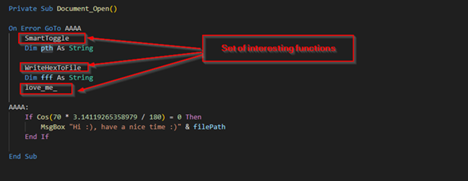 Further extracting the malicious macro, we found that it contains a few sets of interesting functions for performing certain tasks, also we found that the threat actor left a very heart-warming message for analysts and the target which goes as Hi : ), have a nice time : ).