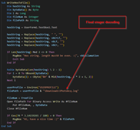 Upon analyzing the function WriteHexToFile, we determined that it is responsible for extracting and reconstructing the final-stage payload from the UserForm1 stream. The function reads a large hex-encoded blob stored within the design-time value of UserForm1.TextBox1.Text, removes all formatting artifacts such as spaces and line breaks, and validates the integrity of the data. It then decodes the hex string byte-by-byte into its raw binary form and writes the reconstructed payload to disk as PhotoAcq.log within the target’s Downloads directory, known as PhotoAcq.log .