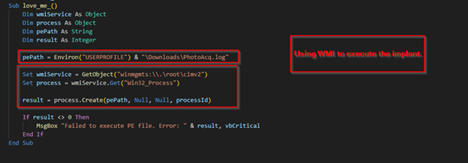 Next, upon looking into the function love_me_ is responsible for executing the reconstructed payload once it has been written to disk. It builds the full path to the dropped file, PhotoAcq.log, located within the victim’s Downloads directory, and leverages Windows Management Instrumentation (WMI) to launch it. Specifically, the macro obtains a handle to the Win32_Process class via the rootcimv2 namespace and invokes the Create method to spawn a new process.