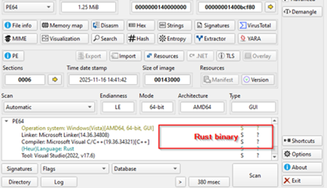 Initially, upon loading the binary into initial analysis tools, we figured out that this is a Rust-based implant.