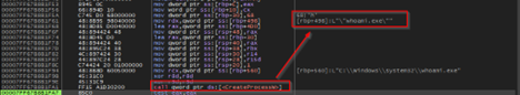 Initially, it executes the command whoami.exe , which is basically a generic behavior performed by implants, although quite noisy.