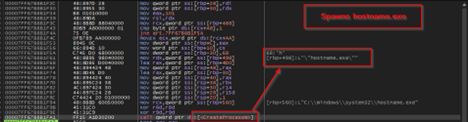 Next, it executes the command hostname.exe , which again is a generic behavior to enumerate the hostname of the target.