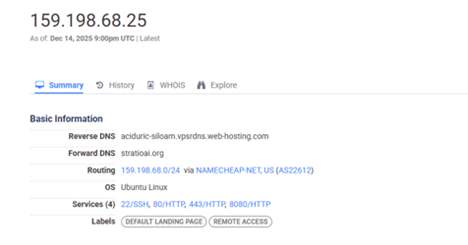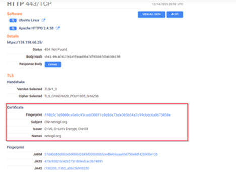 Next, we observed an interesting detail during the infrastructure review. The IP address mapped to the domain was still associated with a netvigil.org CNAME and continued to present a TLS certificate issued for that domain instead of the one we were analyzing. This indicates that the VPS previously hosted netvigil.org and was never fully reconfigured for the new domain. In practice, this type of residue, we believe where the underlying host retains certificates or virtual host entries from an earlier setup, is common on low-cost or repurposed infrastructure often seen in malicious operations.