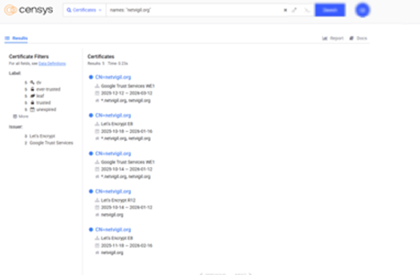 A review of the certificate history in Censys further supports this assessment. When querying for netvigil.org, we identified multiple active and recently issued certificates tied to the same domain, including wildcard entries (*.netvigil.org).