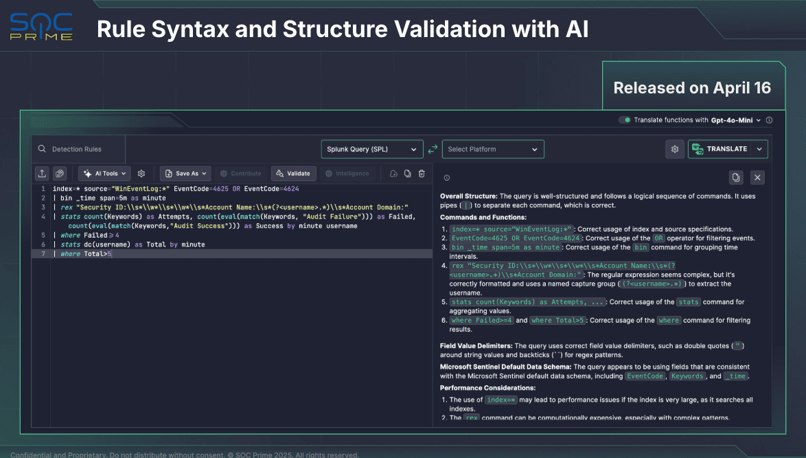 This validation is powered by a locally hosted Llama 3.3 model, fine-tuned for detection engineering and running entirely within SOC Prime’s SOC 2-compliant private cloud infrastructure.
