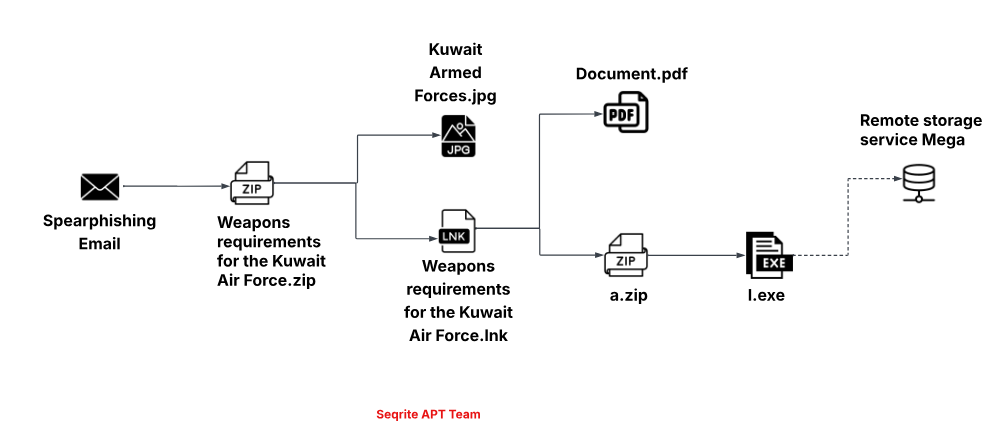 The initial phishing vector we observed was a ZIP file named Weapons requirements for the Kuwait Air Force.zip.