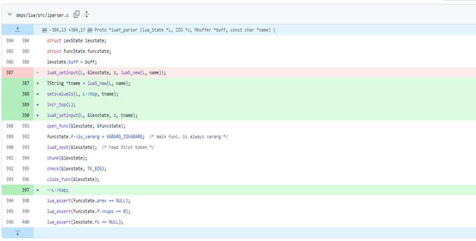 The key change is that Redis now keeps a proper reference to the Lua objects the parser is using (like the chunk name) on the Lua stack while parsing, so the garbage collector sees them as alive and can’t free or move them early.