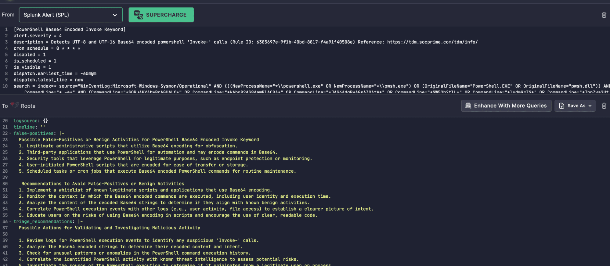 Platform-specific rules or queries—such as those written in Splunk, Sentinel, or other supported formats—can now be automatically transformed into Roota format using Uncoder AI. This isn’t just a format switch; it’s a context-rich conversion process that layers metadata critical to operational success.