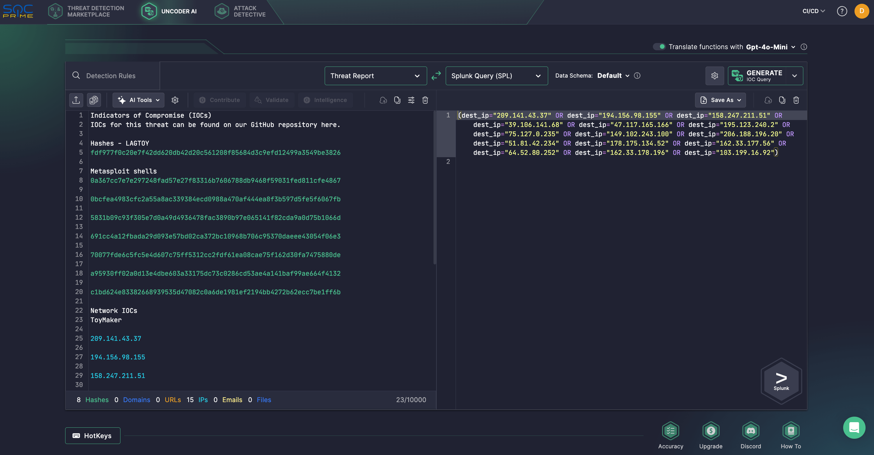 Additionally, security professionals can hunt for IOCs from the latest Cisco research on ToyMaker. With Uncoder AI, security experts can effortlessly parse these IOCs and transform them into custom queries tailored for the chosen SIEM or EDR platform. Uncoder AI also acts as a non-agentic private AI for threat-informed detection engineering, equipping teams with advanced tools to research, code, validate, translate, and deploy detections on the fly.